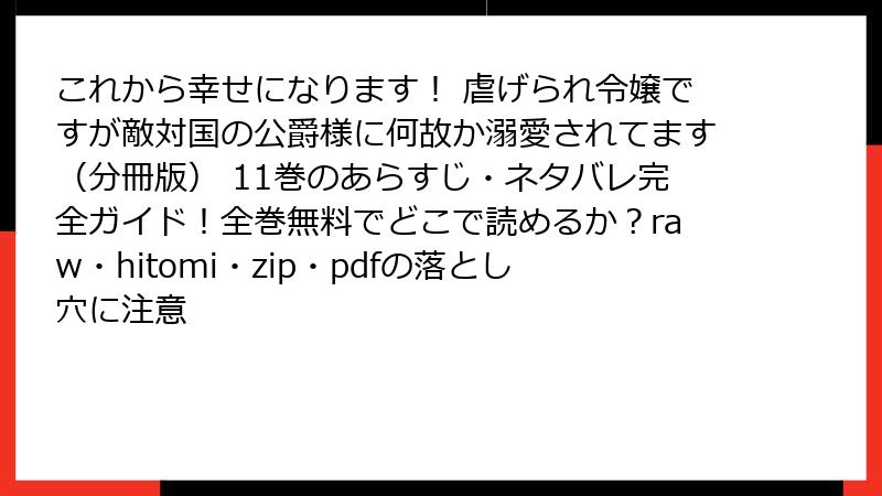 人気のロマンスファンタジー漫画「これから幸せになります! 虐げられ令嬢ですが敵対国の公爵様に何故か溺愛されてます(分冊版)」を、raw/hitomi/zip/pdf/漫画バンクなどの海賊版サイトで読むのは、手軽に思えるかもしれませんが、さまざまな深刻なリスクを伴います。この記事では、法的、セキュリティ、経済的、倫理的な側面から詳しく解説します。海賊版利用は一時的な楽しみのために長期的な損失を招く可能性が高いので、注意が必要です。