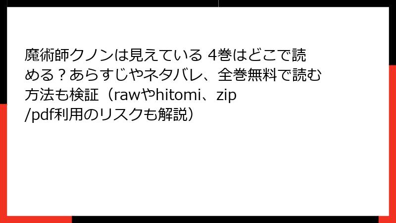 人気漫画「魔術師クノンは見えている」の4巻を、raw、hitomi、zip、pdf、漫画バンクなどの海賊版サイトで無料で読もうとする人は少なくありません。しかし、これらのサイトを利用することは、ただの「無料閲覧」以上の深刻なリスクを伴います。著作権侵害の観点から始まり、ウイルス感染や個人情報漏洩まで、さまざまな危険が潜んでいます。この記事では、海賊版サイトの利用がもたらすリスクを詳しく解説します。合法的な手段で楽しむことを強くおすすめします。