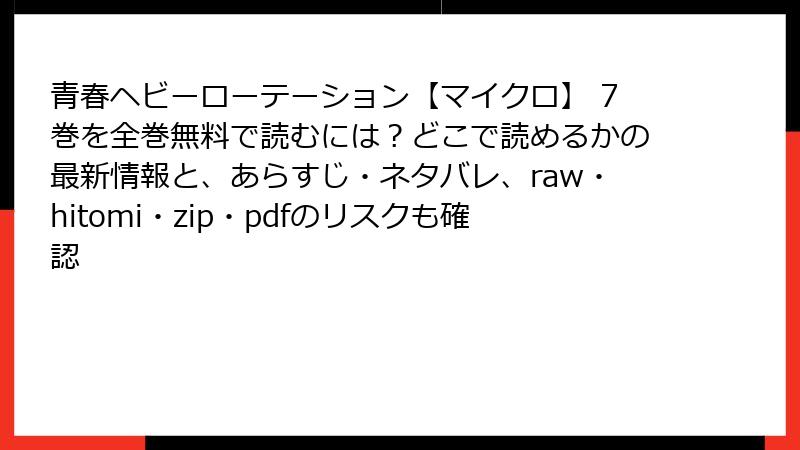 raw、hitomi、zip、pdf、漫画バンクなどの海賊版サイトで「青春ヘビーローテーション【マイクロ】7巻」を読むのは、法的・セキュリティ・倫理的な観点から非常に危険です。代わりに、公式の電子書籍サービスを利用して安全に楽しむことをおすすめします。リスクを理解し、正しい選択をすることで、漫画業界を支えつつ、自分を守ることができます。海賊版の誘惑に負けず、健全な読書生活を送りましょう。