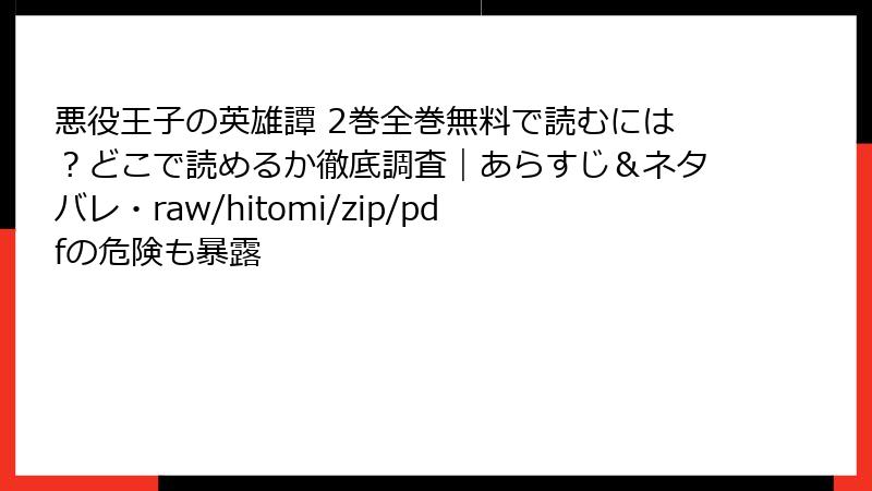 rawやhitomiなどの海賊版サイトで「悪役王子の英雄譚」2巻を読むのは、法的・セキュリティ・倫理的多大なリスクを伴います。ウイルス感染や情報漏洩、業界支援の欠如は、利用者自身に跳ね返ります。公式サイトやアプリで正しく楽しむことで、安全に作品を支えましょう。海賊版は一時的な快楽ですが、長期的損失が大きいことを忘れずに。