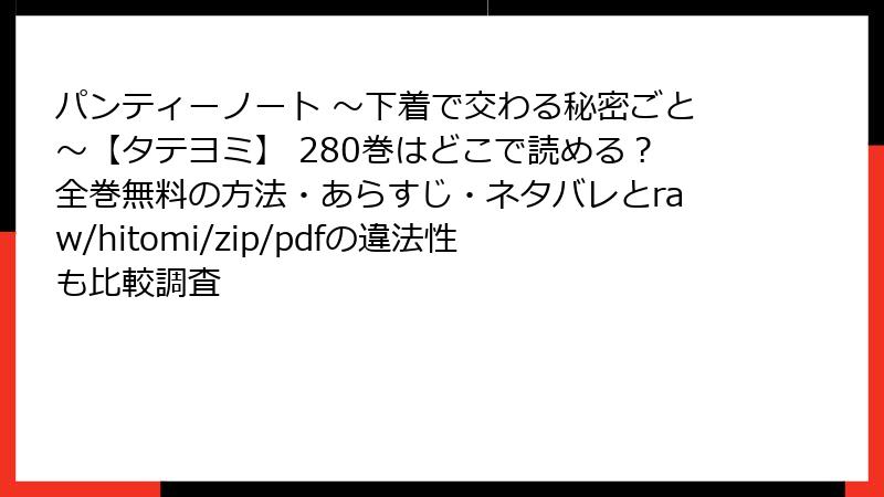 人気のタテヨミコミック「パンティーノート ~下着で交わる秘密ごと~」を、raw、hitomi、zip、pdf、漫画バンクなどの海賊版サイトで読むのは、手軽に思えるかもしれません。しかし、これらのサイトを利用する行為にはさまざまなリスクが伴います。法的問題からセキュリティの脅威まで、詳しく解説します。公式ルートで楽しむことをおすすめしますが、ここではリスクを徹底的に掘り下げてみましょう。