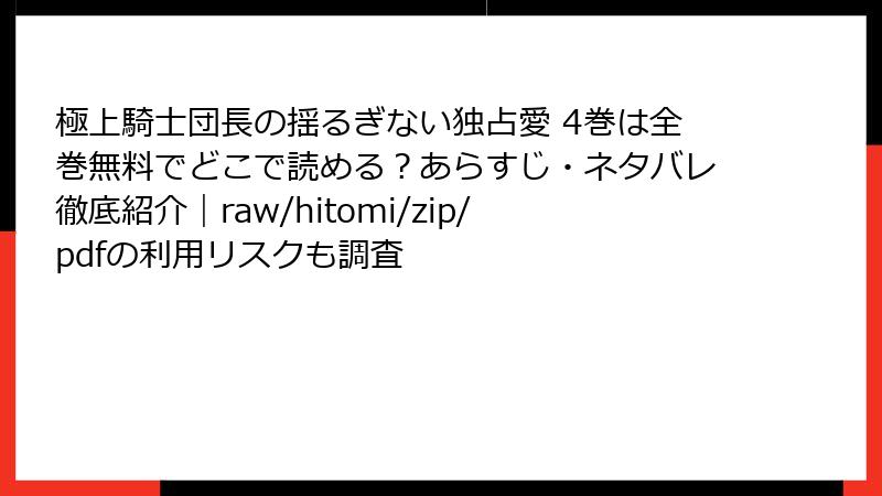 人気のロマンスファンタジー漫画「極上騎士団長の揺るぎない独占愛」を、raw、hitomi、zip、pdf、漫画バンクなどの海賊版サイトで読むのは一見便利に思えますが、深刻なリスクが伴います。この記事では、そうした海賊版サイトの利用がもたらす法的、セキュリティ、倫理的、品質的な問題を詳しく解説します。無料でアクセスできる魅力に隠された危険を理解し、正規の方法で楽しむことをおすすめします。以下で各リスクを深掘りしていきます。