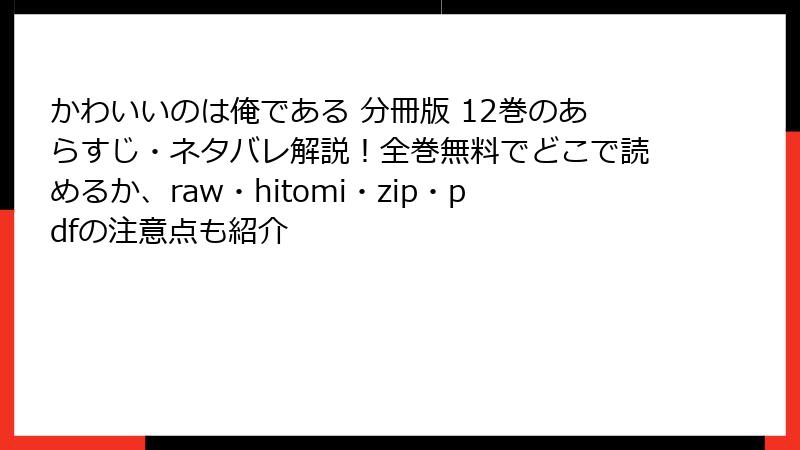 人気漫画「かわいいのは俺である」を、raw、hitomi、zip、pdf、漫画バンクなどの海賊版サイトで読むことは、一見手軽に見えますが、さまざまなリスクを伴います。この記事では、そうした海賊版利用の危険性を詳しく解説します。法的問題からセキュリティ、倫理的側面までを掘り下げ、なぜ正規ルートで楽しむべきかを考えていきましょう。海賊版はクリエイターの権利を侵害する行為であり、避けることを強くおすすめします。