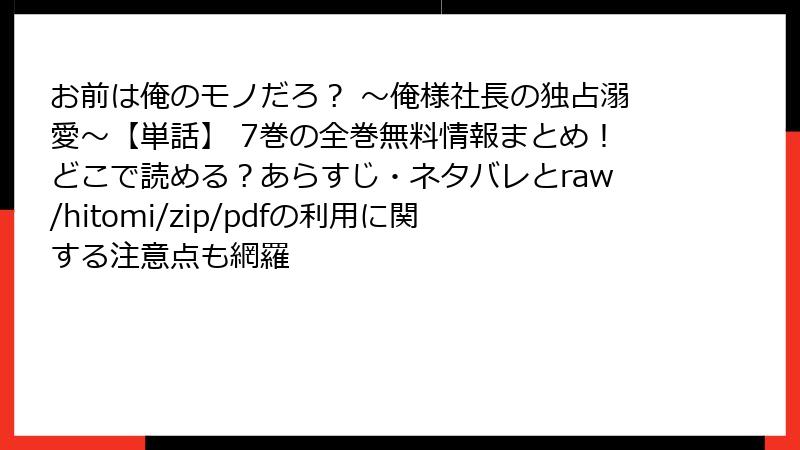人気コミック「お前は俺のモノだろ? ~俺様社長の独占溺愛~【単話】 7巻」を、raw、hitomi、zip、pdf、漫画バンクなどの海賊版サイトで無料で読もうと考える人もいるかもしれません。しかし、これらのサイトを利用することは、さまざまな深刻なリスクを伴います。本記事では、そんな海賊版サイトの利用がもたらす危険性を、法的・セキュリティ面を中心に詳しく解説します。無料の誘惑に負けず、正規の方法で楽しむことを強くおすすめします。