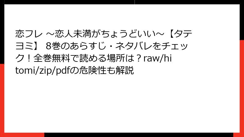 人気タテヨミ漫画「恋フレ ~恋人未満がちょうどいい~」を楽しむ方法として、海賊版サイト(raw、hitomi、zip、pdf、漫画バンクなど)を利用する人もいるかもしれません。しかし、これらのサイトを利用することは、さまざまな深刻なリスクを伴います。この記事では、そうしたリスクを詳しく解説し、なぜ避けるべきかを考察します。海賊版は一見便利ですが、長期的に見てデメリットが大きいのです。参考になる情報を基に、注意喚起を込めてお届けします。