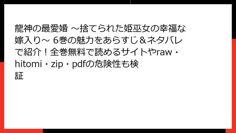 人気の和風ファンタジー漫画「龍神の最愛婚 ~捨てられた姫巫女の幸福な嫁入り~」を無料で読みたいと思い、海賊版サイトに手を出そうとしている方へ。この記事では、そんな違法サイトを利用するリスクを詳しく解説します。raw、hitomi、zip、pdf、漫画バンクなどのサイトは一見便利ですが、裏側に潜む危険が満載です。法的問題からセキュリティの脅威まで、読み応えのある内容でお届けしますので、ぜひ最後までお読みください。
