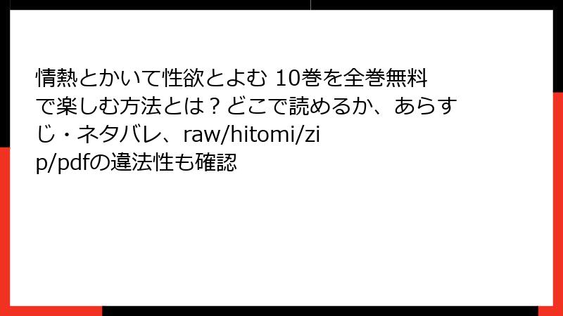 人気コミック「情熱とかいて性欲とよむ」を、raw、hitomi、zip、pdf、漫画バンクなどの海賊版サイトで無料で読もうと考える人もいるかもしれません。しかし、これらのサイトを利用することは、さまざまな深刻なリスクを伴います。この記事では、海賊版サイトの利用がもたらす危険性を詳しく解説します。法的問題からセキュリティの脅威まで、読み応えのある内容でお届けします。合法的な方法で作品を楽しむことを強くおすすめします。