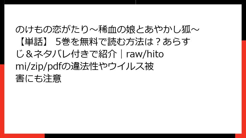 人気の漫画『のけもの恋がたり~稀血の娘とあやかし狐~』の単話版5巻を、raw、hitomi、zip、pdf、漫画バンクなどの海賊版サイトで読む行為は、一見手軽に思えますが、さまざまな深刻なリスクを伴います。この記事では、そんな海賊版利用の危険性を詳しく解説します。法的問題からセキュリティの脅威、さらには倫理的な側面までを掘り下げ、なぜ正規ルートを選ぶべきかを考えていきましょう。海賊版は一時的な楽しみを提供するかもしれませんが、長期的には自分自身や業界全体に悪影響を及ぼします。