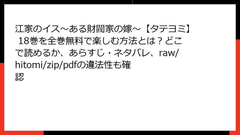 raw/hitomi/zip/pdf/漫画バンクなどの海賊版サイトで「江家のイス~ある財閥家の嫁~【タテヨミ】」を読むのは、法的・セキュリティ・プライバシー・倫理的な観点から見て、大きなリスクを伴います。無料の魅力に惑わされず、公式ルートを選ぶことが、自身を守り、業界を支える賢明な選択です。リスクを知ることで、より安全で楽しい漫画ライフを送りましょう。