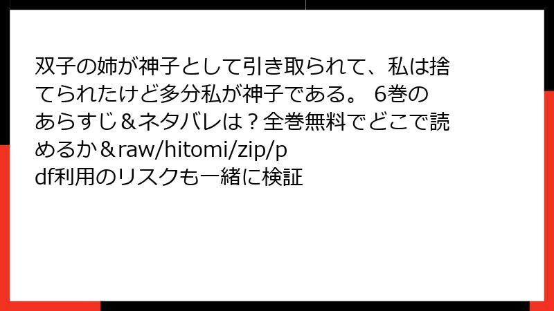 raw、hitomi、zip、pdf、漫画バンクなどの海賊版サイトで「双子の姉が神子として引き取られて、私は捨てられたけど多分私が神子である。」を読むのは、法的・セキュリティ的な危険が多すぎます。逮捕の恐怖やウイルス感染の被害を避け、正規ルートを選ぶのが賢明です。漫画を愛するなら、クリエイターを支援する形で楽しむことをおすすめします。