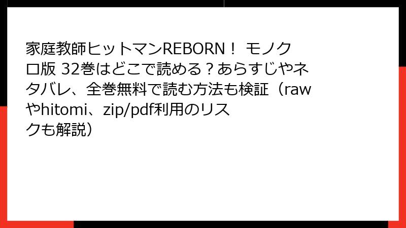 人気漫画「家庭教師ヒットマンREBORN!」の32巻を、raw、hitomi、zip、pdf、漫画バンクなどの海賊版サイトで読むことは、一見手軽に見えますが、さまざまなリスクを伴います。これらのサイトは著作権を侵害した違法コンテンツを提供しており、利用者は知らず知らずのうちに問題に巻き込まれる可能性があります。ここでは、法的、セキュリティ、品質、倫理的側面から詳しく解説します。公式ルートでの購入や購読を推奨しますが、リスクを理解した上で判断してください。