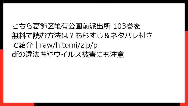 人気長寿漫画「こちら葛飾区亀有公園前派出所」、通称「こち亀」の103巻は、両津勘吉のドタバタ劇が楽しめる一冊ですが、海賊版サイト(raw、hitomi、zip、pdf、漫画バンクなど)で無料読みを試みる人が少なくありません。一見便利に見えるこれらのサイトですが、深刻なリスクが伴います。この記事では、法的・セキュリティ・倫理的な観点から詳しく解説。読み応えを出すために、各リスクを分解し、具体例を交えながら掘り下げます。海賊版利用は一時の節約が大きな代償を生む可能性があることを、ぜひ知ってください。