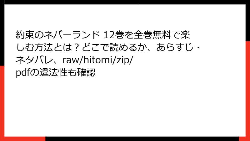 『約束のネバーランド』のような人気漫画を、raw、hitomi、zip、pdf、漫画バンクなどの海賊版サイトで読むのは一見便利に思えますが、深刻なリスクが伴います。これらのサイトは著作権を侵害しており、利用者は法的・セキュリティ的な問題に巻き込まれる可能性が高いです。以下では、具体的なリスクを詳しく解説します。利用を避け、正規のプラットフォームで楽しむことを強くおすすめします。