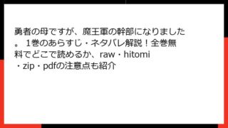 勇者の母ですが、魔王軍の幹部になりました。 勇者の母ですが、魔王軍の幹部になりました。 1巻のあらすじ・ネタバレ解説!全巻無料でどこで読めるか、raw・hitomi・zip・pdfの注意点も紹介 『勇者の母ですが、魔王軍の幹部になりました。』1巻:異世界で母の愛が魔王軍を変える! 詳細あらすじレビューこんにちは、漫画好きのブロガーです! 今日のレビューは、野山歩さん原作、ツヅルさん作画による異世界ファンタジー『勇者の母ですが、魔王軍... 2025.11.02 勇者の母ですが、魔王軍の幹部になりました。青年マンガ・コミック