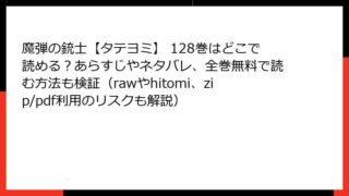 少年マンガ・コミック 魔弾の銃士【タテヨミ】 128巻はどこで読める?あらすじやネタバレ、全巻無料で読む方法も検証(rawやhitomi、zip/pdf利用のリスクも解説) 魔力9999万 全属性使いの大賢者【タテヨミ】 128巻:圧倒的な力と因縁の渦巻くクライマックスを徹底レビューこんにちは、ファンタジー漫画大好きブロガーのマガジンです! 今日も熱いウェブトゥーンをお届けします。HykeComicで連載中の人... 2025.11.02 少年マンガ・コミック魔弾の銃士【タテヨミ】