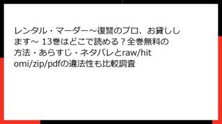 レンタル・マーダー~復讐のプロ、お貸しします~ レンタル・マーダー~復讐のプロ、お貸しします~ 13巻はどこで読める?全巻無料の方法・あらすじ・ネタバレとraw/hitomi/zip/pdfの違法性も比較調査 レンタル・マーダー~復讐のプロ、お貸しします~ 13巻:壮絶な復讐の渦中へ! 詳細あらすじレビューみなさん、こんにちは! 漫画好きのブロガー、コミックハンターです。今日は、コミックシーモアで大人気のサスペンス復讐漫画『レンタル・マーダー~復... 2025.11.02 レンタル・マーダー~復讐のプロ、お貸しします~青年マンガ・コミック