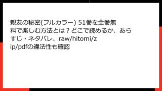 親友の秘密(フルカラー) 親友の秘密(フルカラー) 51巻を全巻無料で楽しむ方法とは?どこで読めるか、あらすじ・ネタバレ、raw/hitomi/zip/pdfの違法性も確認 親友の秘密(フルカラー)51巻:禁断の渦巻くクライマックスへこんにちは、マンガ好きのブロガーです! 今日は、人気フルカラーマンガ『親友の秘密(フルカラー)』の51巻について、詳しくあらすじを掘り下げてお届けします。この作品は、親友の恋人との... 2025.11.03 親友の秘密(フルカラー)青年マンガ・コミック