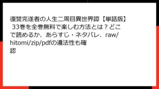 復讐完遂者の人生二周目異世界譚【単話版】 復讐完遂者の人生二周目異世界譚【単話版】 33巻を全巻無料で楽しむ方法とは?どこで読めるか、あらすじ・ネタバレ、raw/hitomi/zip/pdfの違法性も確認 復讐完遂者の人生二周目異世界譚【単話版】33巻:黒の英雄の影が深まる戦いの渦中こんにちは、異世界ファンの皆さん! 今日のブログ記事では、人気コミック「復讐完遂者の人生二周目異世界譚【単話版】」の第33巻について、詳しくあらすじを掘り下げてお... 2025.11.07 復讐完遂者の人生二周目異世界譚【単話版】青年マンガ・コミック
