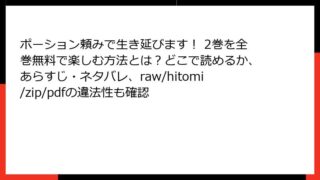 ポーション頼みで生き延びます! ポーション頼みで生き延びます! 2巻を全巻無料で楽しむ方法とは?どこで読めるか、あらすじ・ネタバレ、raw/hitomi/zip/pdfの違法性も確認 ポーション頼みで生き延びます! 続 2巻:異世界のドタバタ冒険がさらに加速!異世界転生ファンタジーの人気作『ポーション頼みで生き延びます!』が、漫画版として新章に突入した『続』シリーズ。原作小説の魅力であるユーモアあふれるストーリーと、主人... 2025.11.07 ポーション頼みで生き延びます!少年マンガ・コミック