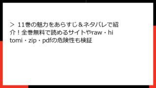 > > 11巻の魅力をあらすじ&ネタバレで紹介!全巻無料で読めるサイトやraw・hitomi・zip・pdfの危険性も検証