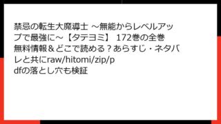 少年マンガ・コミック 禁忌の転生大魔導士 ~無能からレベルアップで最強に~【タテヨミ】 172巻の全巻無料情報&どこで読める?あらすじ・ネタバレと共にraw/hitomi/zip/pdfの落とし穴も検証 禁忌の転生大魔導士 ~無能からレベルアップで最強に~【タテヨミ】 172巻:逆転の魔法が世界を変える!こんにちは、ファンタジー漫画好きのブロガーです! 今日のレビューは、熱いバトルと成長物語が魅力の人気ウェブトゥーン【タテヨミ】版『禁忌の転... 2025.11.08 少年マンガ・コミック禁忌の転生大魔導士 ~無能からレベルアップで最強に~【タテヨミ】
