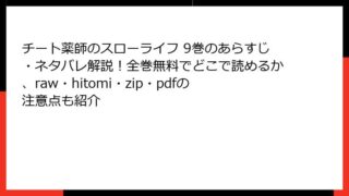 チート薬師のスローライフ チート薬師のスローライフ 9巻のあらすじ・ネタバレ解説!全巻無料でどこで読めるか、raw・hitomi・zip・pdfの注意点も紹介 チート薬師のスローライフ 9巻:異世界ドラッグストアの愉快な日常がさらに加速!こんにちは、ファンタジー漫画好きの皆さん! 今日のブログ記事では、異世界転生ものの定番ながら、のんびりとしたスローライフが魅力の人気作『チート薬師のスローライフ ... 2025.11.09 チート薬師のスローライフ青年マンガ・コミック