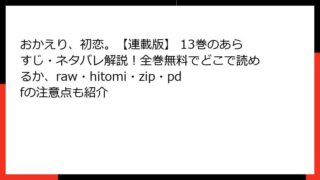 おかえり、初恋。【連載版】 おかえり、初恋。【連載版】 13巻のあらすじ・ネタバレ解説!全巻無料でどこで読めるか、raw・hitomi・zip・pdfの注意点も紹介 おかえり、初恋。【連載版】13巻の魅力に迫る! 甘酸っぱい恋の新展開を徹底解説こんにちは、漫画好きの皆さん! 今日は、かめみずとら先生の心温まるラブストーリー『おかえり、初恋。【連載版】』の13巻について、詳しくお話ししていきたいと思います... 2025.11.09 おかえり、初恋。【連載版】少女マンガ・コミック