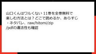 少女マンガ・コミック 山口くんはワルくない 11巻を全巻無料で楽しむ方法とは?どこで読めるか、あらすじ・ネタバレ、raw/hitomi/zip/pdfの違法性も確認 『山口くんはワルくない』11巻の魅力に迫る! 2年生編の甘酸っぱいラブストーリーあらすじレビューこんにちは、漫画大好きブロガーのあかりです! 今日は、斉木優先生の人気青春ラブコメ『山口くんはワルくない』の最新巻、11巻について詳しくお話しし... 2025.11.10 少女マンガ・コミック山口くんはワルくない
