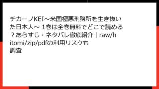 チカーノKEI~米国極悪刑務所を生き抜いた日本人~ チカーノKEI~米国極悪刑務所を生き抜いた日本人~ 1巻は全巻無料でどこで読める?あらすじ・ネタバレ徹底紹介|raw/hitomi/zip/pdfの利用リスクも調査 チカーノKEI~米国極悪刑務所を生き抜いた日本人~ 1巻 詳細あらすじレビュー作品概要と背景この漫画は、原作KEI、作画マサシによる実録プリズンサバイバルストーリー。主人公のKEIは、1961年東京生まれの元ヤクザで、FBIのおとり捜査に引... 2025.11.10 チカーノKEI~米国極悪刑務所を生き抜いた日本人~青年マンガ・コミック