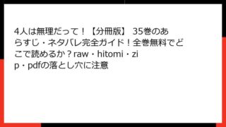 4人は無理だって!【分冊版】 4人は無理だって!【分冊版】 35巻のあらすじ・ネタバレ完全ガイド!全巻無料でどこで読めるか?raw・hitomi・zip・pdfの落とし穴に注意 『4人は無理だって!【分冊版】35巻』詳細あらすじと見どころ作品概要とこれまでの流れ『4人は無理だって!』は、オーソドックス(原作)/タス(作画)による人気の成人向けラブコメディ作品。主人公の29歳就活浪人生・尾平千勝(おひら ちかつ)が、... 2025.11.10 4人は無理だって!【分冊版】青年マンガ・コミック