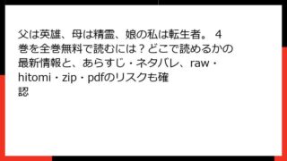 父は英雄、母は精霊、娘の私は転生者。 父は英雄、母は精霊、娘の私は転生者。 4巻を全巻無料で読むには?どこで読めるかの最新情報と、あらすじ・ネタバレ、raw・hitomi・zip・pdfのリスクも確認 『父は英雄、母は精霊、娘の私は転生者。』4巻 詳細あらすじ&見どころ新章開幕! 11歳のエレンが迎える新たな日常前巻までの王家との激しいいさかいから2年が経過した世界。主人公のエレンは無事に11歳を迎えましたが、精霊の血が強いせいか見た目は... 2025.11.10 父は英雄、母は精霊、娘の私は転生者。青年マンガ・コミック