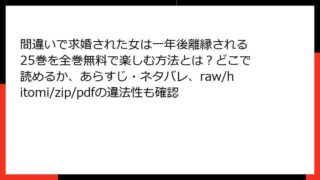 女性マンガ・コミック 間違いで求婚された女は一年後離縁される 25巻を全巻無料で楽しむ方法とは?どこで読めるか、あらすじ・ネタバレ、raw/hitomi/zip/pdfの違法性も確認 間違いで求婚された女は一年後離縁される 25巻:切ない恋のクライマックスを読み解く皆さん、こんにちは! 少女漫画大好きブロガーのミライです。今日は、ほいっぷくりーむ先生の美しい作画とヤマトミライ先生の心揺さぶる原作で贈る人気作、『間違いで求... 2025.11.10 女性マンガ・コミック間違いで求婚された女は一年後離縁される