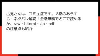 古見さんは、コミュ症です。 古見さんは、コミュ症です。 8巻のあらすじ・ネタバレ解説!全巻無料でどこで読めるか、raw・hitomi・zip・pdfの注意点も紹介 古見さんは、コミュ症です。8巻 詳細あらすじ:コミュ障少女の小さな一歩が加速する日常巻全体のテーマと導入部8巻は、文化祭の熱狂から一転して日常の細やかな人間関係に焦点を当てる転換期。古見硝子の「100人の友達を作る」目標が、クラスメイトとの... 2025.11.11 古見さんは、コミュ症です。少年マンガ・コミック