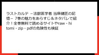 ラストカルテ -法獣医学者 当麻健匠の記憶- ラストカルテ -法獣医学者 当麻健匠の記憶- 7巻の魅力をあらすじ&ネタバレで紹介!全巻無料で読めるサイトやraw・hitomi・zip・pdfの危険性も検証 『ラストカルテ -法獣医学者 当麻健匠の記憶-』7巻:動物たちの魂が紡ぐ感動の記憶こんにちは、漫画好きのブロガーです! 今日は、浅山わかび先生の傑作法獣医学ミステリー『ラストカルテ -法獣医学者 当麻健匠の記憶-』の7巻について、詳しくあら... 2025.11.12 ラストカルテ -法獣医学者 当麻健匠の記憶-少年マンガ・コミック