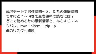 少年マンガ・コミック 栽培チートで最強菜園~え、ただの家庭菜園ですけど?~ 4巻を全巻無料で読むには?どこで読めるかの最新情報と、あらすじ・ネタバレ、raw・hitomi・zip・pdfのリスクも確認 栽培チートで最強菜園~え、ただの家庭菜園ですけど?~ 4巻:チート級の菜園が王都を席巻!? 詳細あらすじレビューみなさん、こんにちは! ファンタジー好きのブログ主です。今日は、スクウェア・エニックスから出ている人気コミック『栽培チートで最強... 2025.11.13 少年マンガ・コミック栽培チートで最強菜園~え、ただの家庭菜園ですけど?~