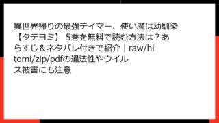 少年マンガ・コミック 異世界帰りの最強テイマー、使い魔は幼馴染【タテヨミ】 5巻を無料で読む方法は?あらすじ&ネタバレ付きで紹介|raw/hitomi/zip/pdfの違法性やウイルス被害にも注意 異世界帰りの最強テイマー、使い魔は幼馴染 5巻:帰還後の世界で繰り広げられる無双劇の深層へこんにちは、ファンタジー漫画好きの皆さん! 今日のレビューは、すかいふぁーむ原作、冥土院ヘブんネーム構成、booklistaSTUDIO作画による大人... 2025.11.13 少年マンガ・コミック異世界帰りの最強テイマー、使い魔は幼馴染【タテヨミ】