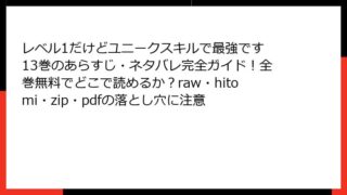 レベル1だけどユニークスキルで最強です レベル1だけどユニークスキルで最強です 13巻のあらすじ・ネタバレ完全ガイド!全巻無料でどこで読めるか?raw・hitomi・zip・pdfの落とし穴に注意 レベル1だけどユニークスキルで最強です 13巻:収穫祭の危機と新たなる脅威の詳細あらすじ人気異世界ファンタジー漫画『レベル1だけどユニークスキルで最強です』の13巻が登場! 主人公・佐藤亮太のユニークスキル「鑑定・目録」がもたらす無限の可能... 2025.11.16 レベル1だけどユニークスキルで最強です少年マンガ・コミック
