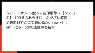 タッチ・オン!~触って封印解除~【タテヨミ】 タッチ・オン!~触って封印解除~【タテヨミ】 103巻のあらすじ・ネタバレ解説!全巻無料でどこで読めるか、raw・hitomi・zip・pdfの注意点も紹介 タッチ・オン!~触って封印解除~ 103巻:封印解除のクライマックスが迫る! 詳細あらすじレビューこんにちは、漫画好きのブロガーです! 今日もエロティックでハラハラする大人向けコミックの世界に飛び込んでみましょう。ジムティージー先生の傑作「... 2025.11.16 タッチ・オン!~触って封印解除~【タテヨミ】青年マンガ・コミック