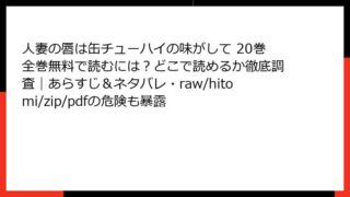 人妻の唇は缶チューハイの味がして 人妻の唇は缶チューハイの味がして 20巻全巻無料で読むには?どこで読めるか徹底調査|あらすじ&ネタバレ・raw/hitomi/zip/pdfの危険も暴露 人妻の唇は缶チューハイの味がして 20巻 詳細あらすじ人気の不倫ラブストーリー漫画『人妻の唇は缶チューハイの味がして』がついに20巻を迎えました。この巻では、主人公たちの関係が新たな局面を迎え、感情の渦がさらに激しく巻き起こります。日常のさ... 2025.11.16 人妻の唇は缶チューハイの味がして青年マンガ・コミック