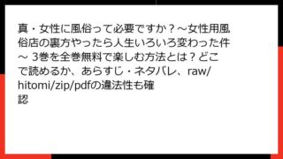 女性マンガ・コミック 真・女性に風俗って必要ですか?~女性用風俗店の裏方やったら人生いろいろ変わった件~ 3巻を全巻無料で楽しむ方法とは?どこで読めるか、あらすじ・ネタバレ、raw/hitomi/zip/pdfの違法性も確認 『真・女性に風俗って必要ですか?~女性用風俗店の裏方やったら人生いろいろ変わった件~』3巻の魅力に迫る! リアルで笑えて泣ける女風エッセイの最新展開こんにちは、漫画好きのブロガーです! 今回は、ヤチナツ先生の人気コミックエッセイ『真・女性に... 2025.11.17 女性マンガ・コミック真・女性に風俗って必要ですか?~女性用風俗店の裏方やったら人生いろいろ変わった件~