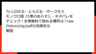 To LOVEる―とらぶる―ダークネス モノクロ版 To LOVEる―とらぶる―ダークネス モノクロ版 15巻のあらすじ・ネタバレをチェック!全巻無料で読める場所は?raw/hitomi/zip/pdfの危険性も解説 To LOVEる―とらぶる―ダークネス モノクロ版 15巻 詳細あらすじレビューこんにちは、漫画好きの皆さん! 今日のレビューは、人気ラブコメディシリーズの続編「To LOVEる―とらぶる―ダークネス」のモノクロ版15巻です。この巻は、シリ... 2025.11.18 To LOVEる―とらぶる―ダークネス モノクロ版少年マンガ・コミック