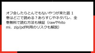 オフ会したらとんでもないやつが来た話 オフ会したらとんでもないやつが来た話 1巻はどこで読める?あらすじやネタバレ、全巻無料で読む方法も検証(rawやhitomi、zip/pdf利用のリスクも解説) オフ会したらとんでもないやつが来た話 1巻:隠れオタクとヤクザの意外な出会いこんにちは、漫画好きのブロガーです! 今日は、講談社から発行された人気のギャグ漫画『オフ会したらとんでもないやつが来た話』1巻のあらすじを、たっぷりとお届けします。... 2025.11.18 オフ会したらとんでもないやつが来た話少年マンガ・コミック