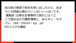 女性マンガ・コミック 目の前の惨劇で前世を思い出したけど、あまりにも問題山積みでいっぱいいっぱいです。 連載版 10巻を全巻無料で読むには?どこで読めるかの最新情報と、あらすじ・ネタバレ、raw・hitomi・zip・pdfのリスクも確認