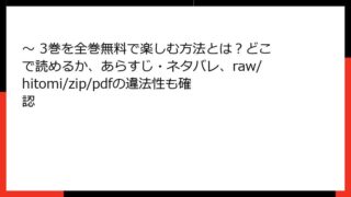 ~ ~ 3巻を全巻無料で楽しむ方法とは?どこで読めるか、あらすじ・ネタバレ、raw/hitomi/zip/pdfの違法性も確認 この漫画・コミックの、ネタバレ情報を詳しく。単一のの見出しタグから始めて、ブログ記事形式で出力して。複数のタグを使用して、読み応えがあるように。HTMLで出力。やなどの箇条書きのHTMLタグや、tableタグも使用してOK。ただし、リンクや... 2025.11.26 青年マンガ・コミック~