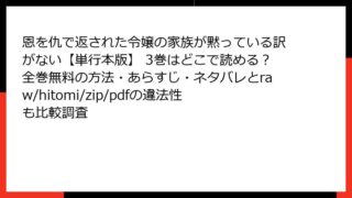 女性マンガ・コミック 恩を仇で返された令嬢の家族が黙っている訳がない【単行本版】 3巻はどこで読める?全巻無料の方法・あらすじ・ネタバレとraw/hitomi/zip/pdfの違法性も比較調査 3組の幼なじみ 2巻幼なじみという特別な関係が織りなす、甘酸っぱい恋模様を描いたラブコメディの第2巻。作者のイトノコさんが描く、3組の高校生たちの日常は、友情と恋の狭間で揺れ動き、読者の心をくすぐります。1巻からの続きとして、みのりと隼太の... 2025.11.27 女性マンガ・コミック恩を仇で返された令嬢の家族が黙っている訳がない【単行本版】