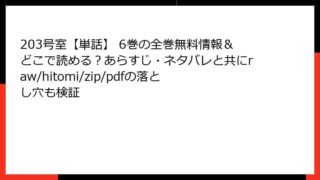 203号室【単話】 203号室【単話】 6巻の全巻無料情報&どこで読める?あらすじ・ネタバレと共にraw/hitomi/zip/pdfの落とし穴も検証 この漫画・コミックの、ネタバレ情報を詳しく。単一のの見出しタグから始めて、ブログ記事形式で出力して。複数のタグを使用して、読み応えがあるように。HTMLで出力。やなどの箇条書きのHTMLタグや、tableタグも使用してOK。ただし、リンクや... 2025.11.28 203号室【単話】青年マンガ・コミック
