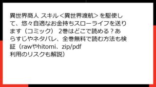異世界商人 スキル<異世界渡航>を駆使して、悠々自適なお金持ちスローライフを送ります(コミック) 異世界商人 スキル<異世界渡航>を駆使して、悠々自適なお金持ちスローライフを送ります(コミック) 2巻はどこで読める?あらすじやネタバレ、全巻無料で読む方法も検証(rawやhitomi、zip/pdf利用のリスクも解説)