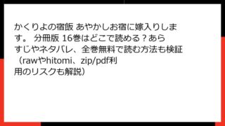 かくりよの宿飯 あやかしお宿に嫁入りします。 分冊版 かくりよの宿飯 あやかしお宿に嫁入りします。 分冊版 16巻はどこで読める?あらすじやネタバレ、全巻無料で読む方法も検証(rawやhitomi、zip/pdf利用のリスクも解説)
