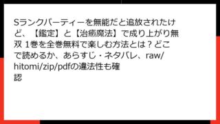 Sランクパーティーを無能だと追放されたけど、【鑑定】と【治癒魔法】で成り上がり無双 Sランクパーティーを無能だと追放されたけど、【鑑定】と【治癒魔法】で成り上がり無双 1巻を全巻無料で楽しむ方法とは?どこで読めるか、あらすじ・ネタバレ、raw/hitomi/zip/pdfの違法性も確認