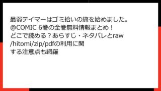 少年マンガ・コミック 最弱テイマーはゴミ拾いの旅を始めました。@COMIC 6巻の全巻無料情報まとめ!どこで読める?あらすじ・ネタバレとraw/hitomi/zip/pdfの利用に関する注意点も網羅 最弱テイマーはゴミ拾いの旅を始めました。@COMIC 第6巻 詳細あらすじ『最弱テイマーはゴミ拾いの旅を始めました。@COMIC』は、ほのぼのとした癒し系ファンタジーとして人気を博す作品です。第6巻では、主人公アイビーと仲間たちがハタウ村で... 2025.12.09 少年マンガ・コミック最弱テイマーはゴミ拾いの旅を始めました。@COMIC